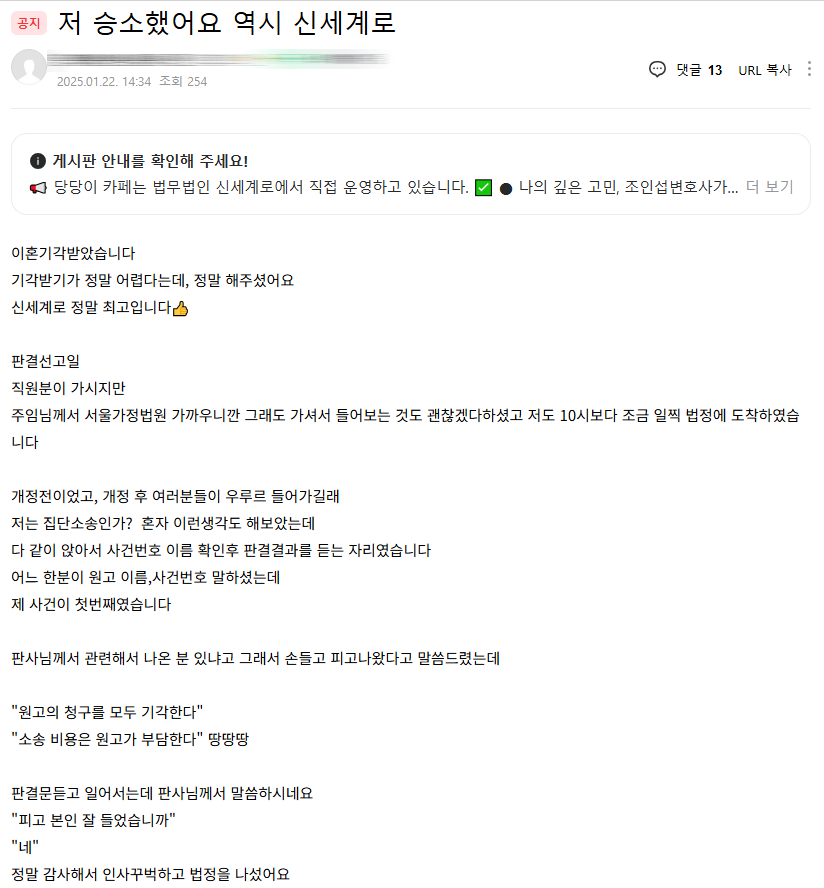 의뢰인께서 이혼 기각을 구하는 입장이었고 결국에 판결선고로 기각이 확인되어 너무 기뻐하셨습니다. 짧지 않은 시간이었고 마음졸이며 결과를 기다리셨을텐데 정말 원하시던 선고를 확인하시게 되어 법인에서도 모두 환호하였지요. 의뢰인께서 만족하셔서 무척 기뻐했던 사건입니다